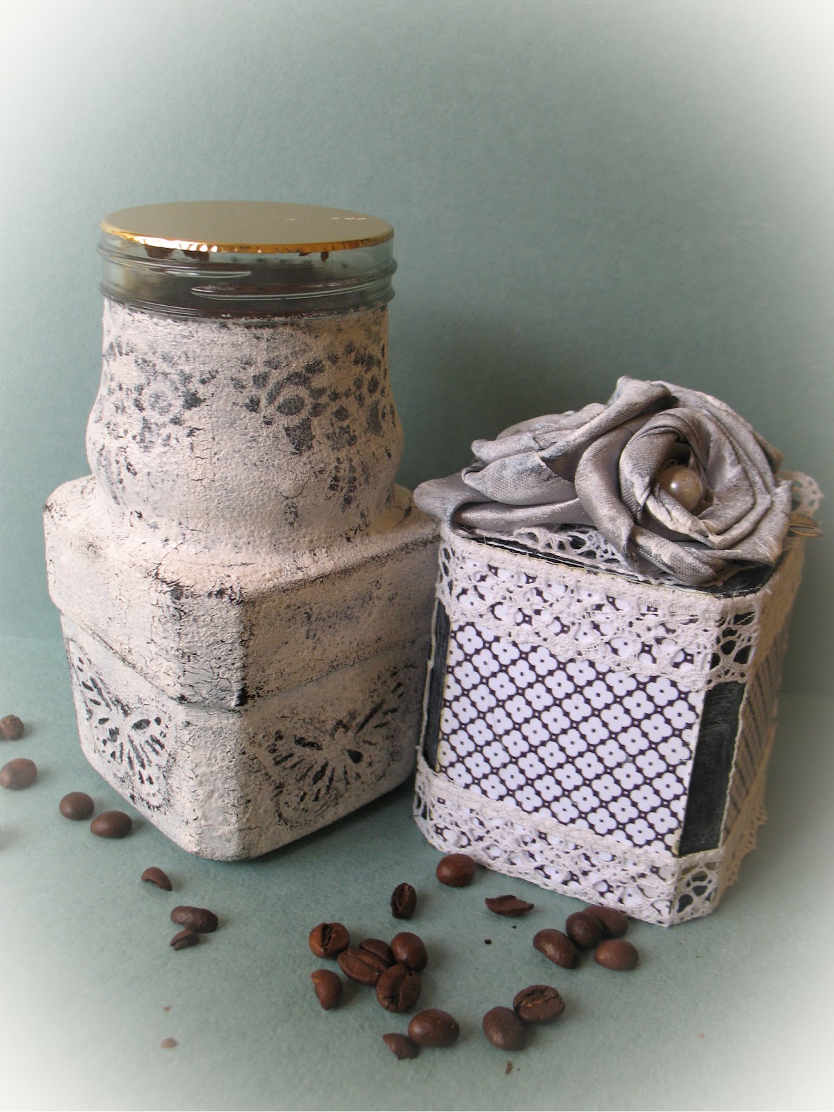 Заводская упаковка,естественно нерушима и в банке остается "родной" кофе...что делала-красила акрилом по стеклу, покрывала кракелюром и финишно отпечатки через трафареты...получилось очень фактурно..