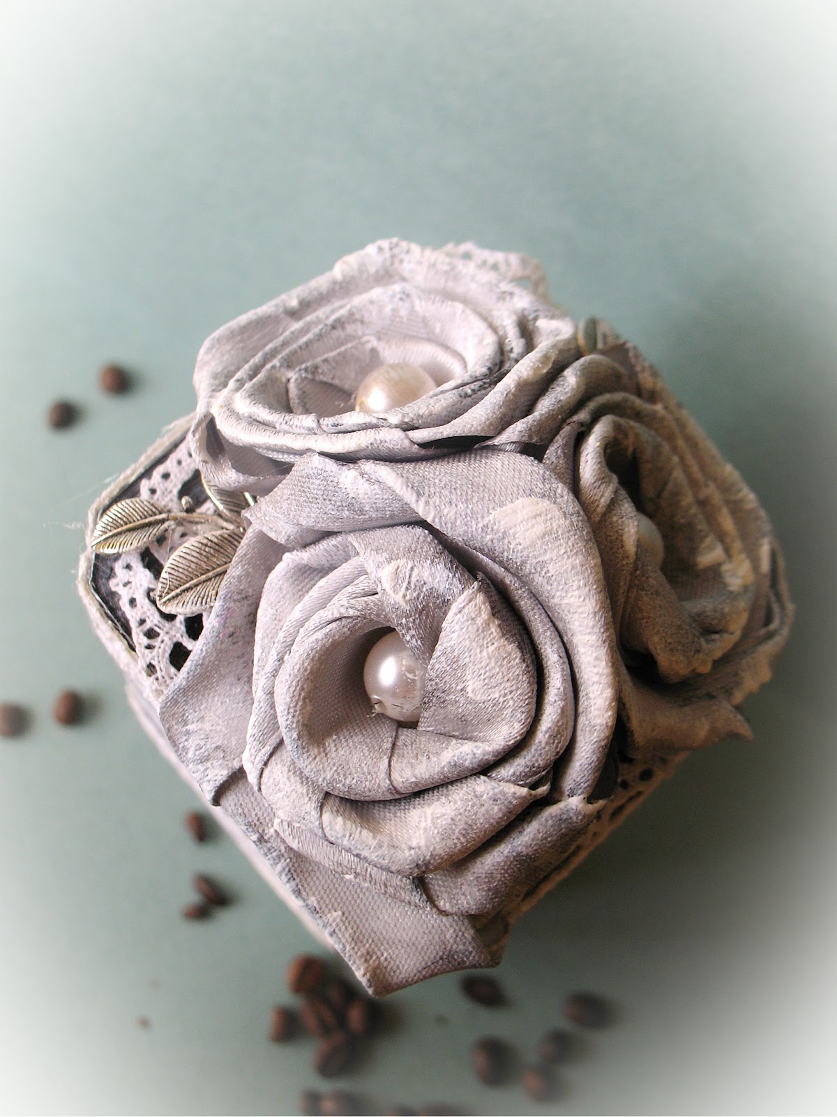 Крышку украсила атласными розами...если чуть-чуть пройтись по таким розам акрилом,то вот в таком сером цвете они становятся очень похожи на гипсовые,что по настроению очень подходит...