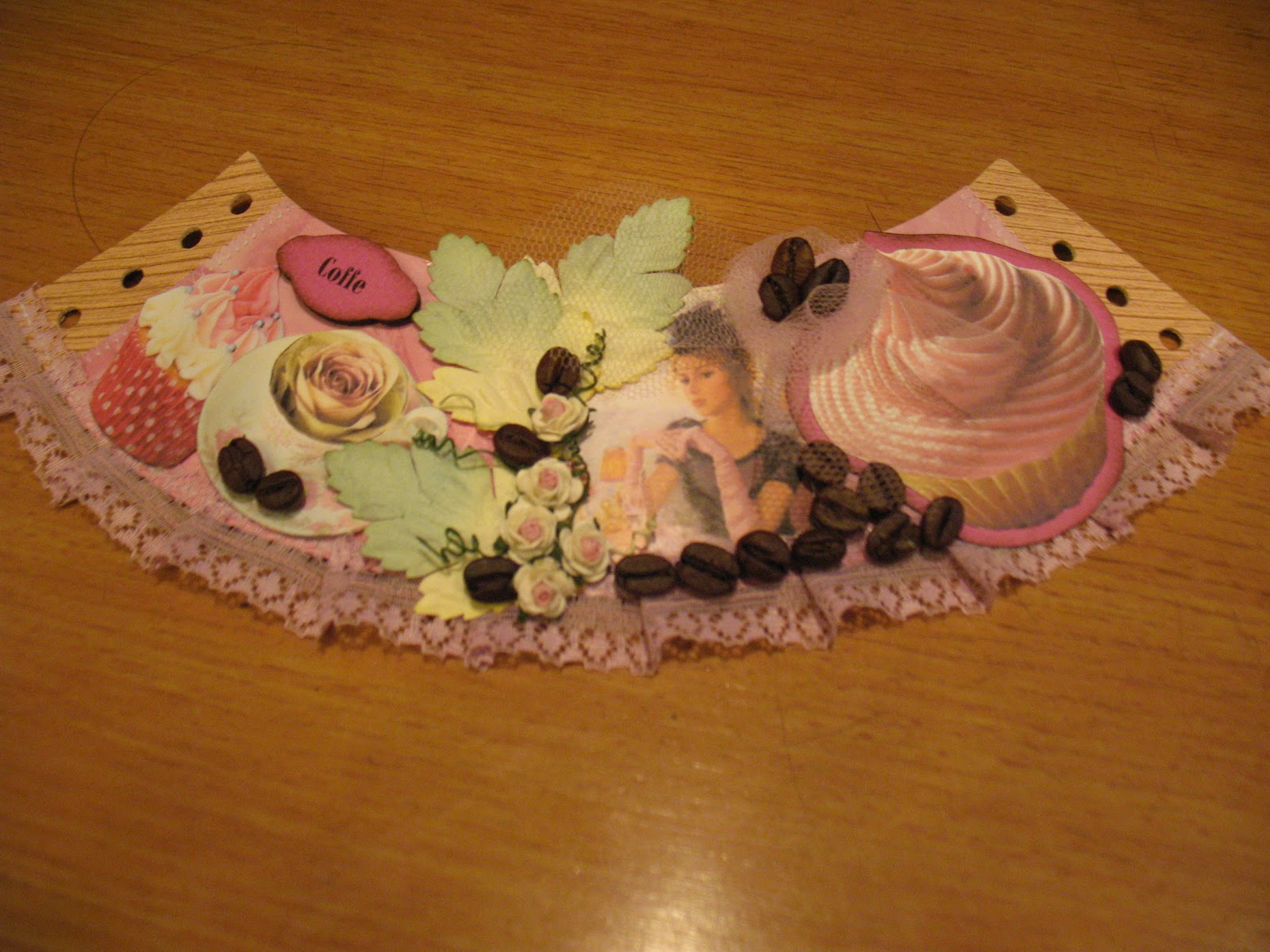 Потом заполняю левую сторону...там у меня чашечка с цветком, еще одно пирожное и чипборд с надписью "кофе"..